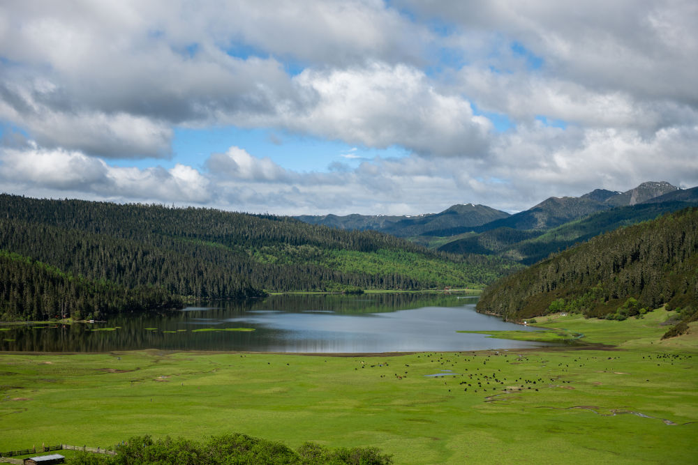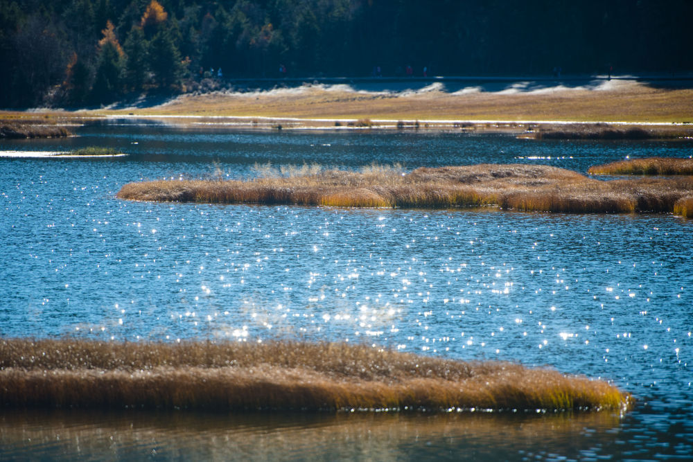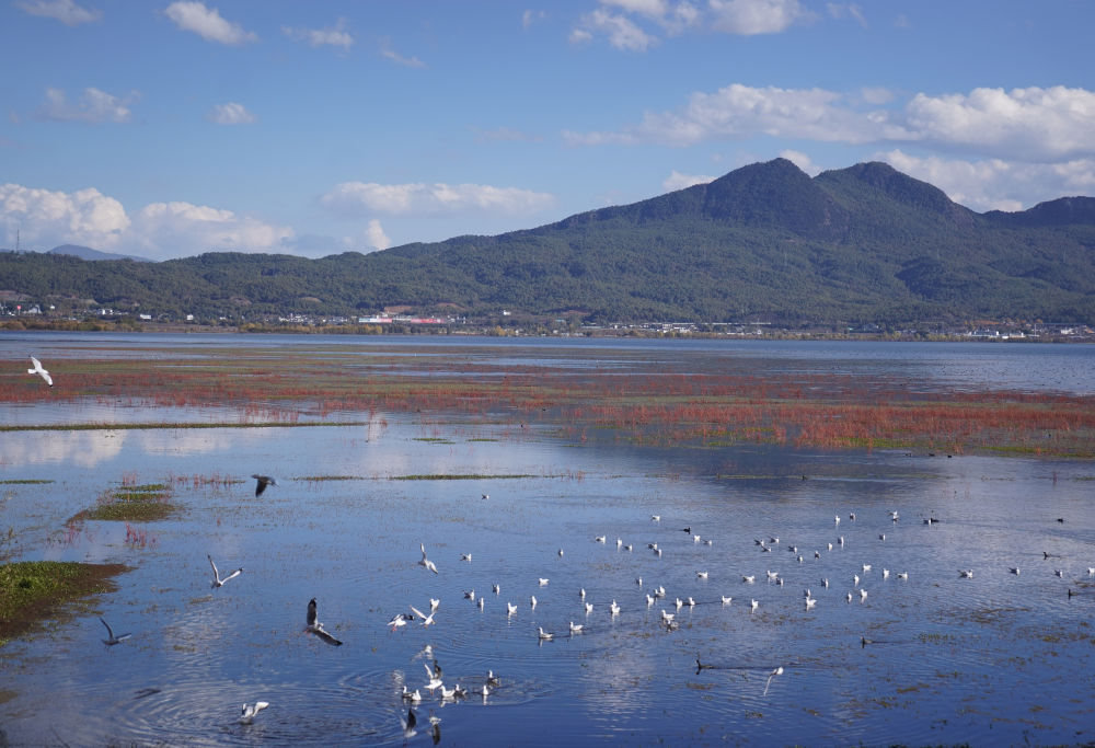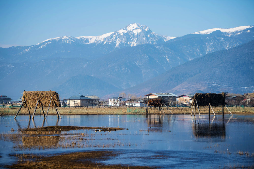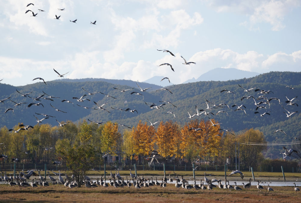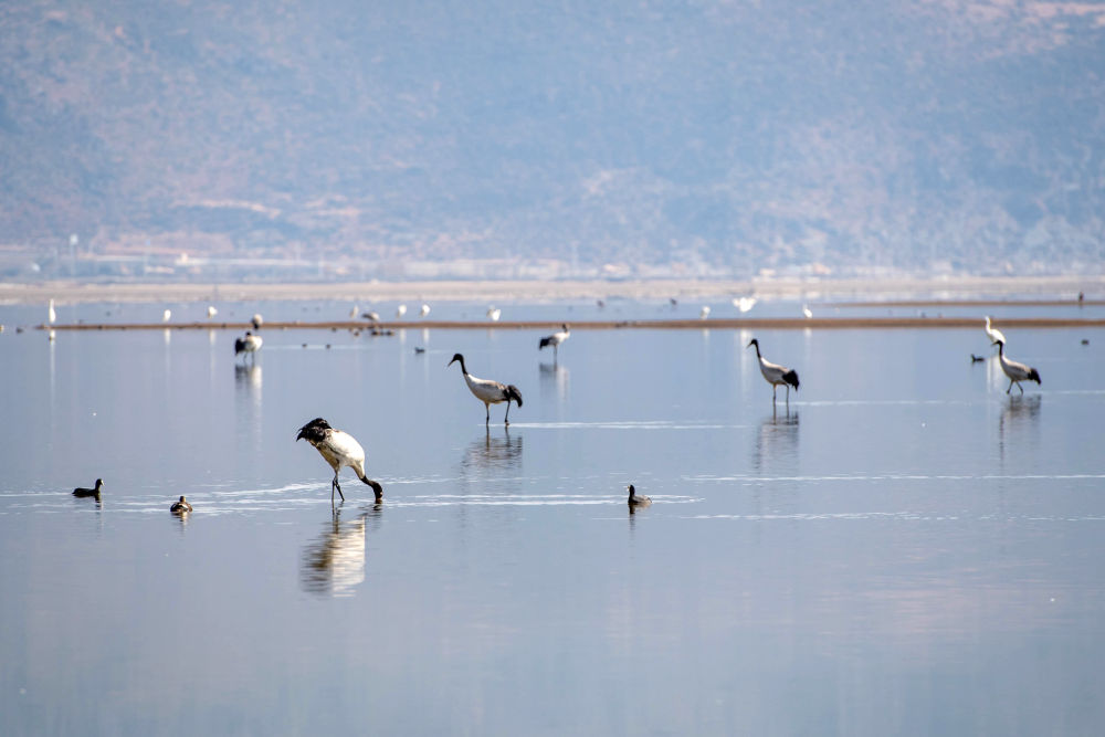 黑颈鹤和水鸟在纳帕海自然保护区栖息。