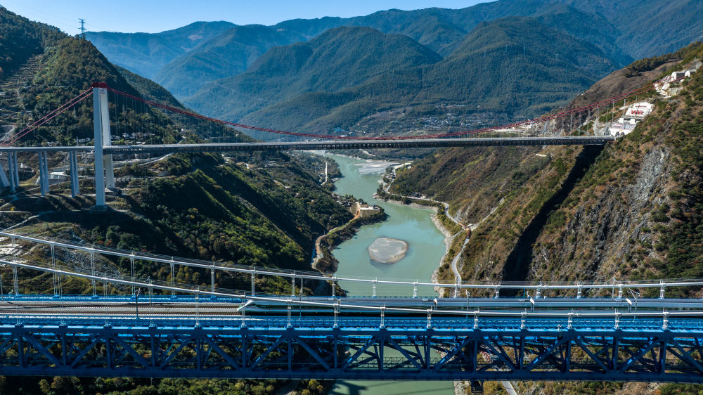 11月26日,列车驶过虎跳峡金沙江铁路大桥。