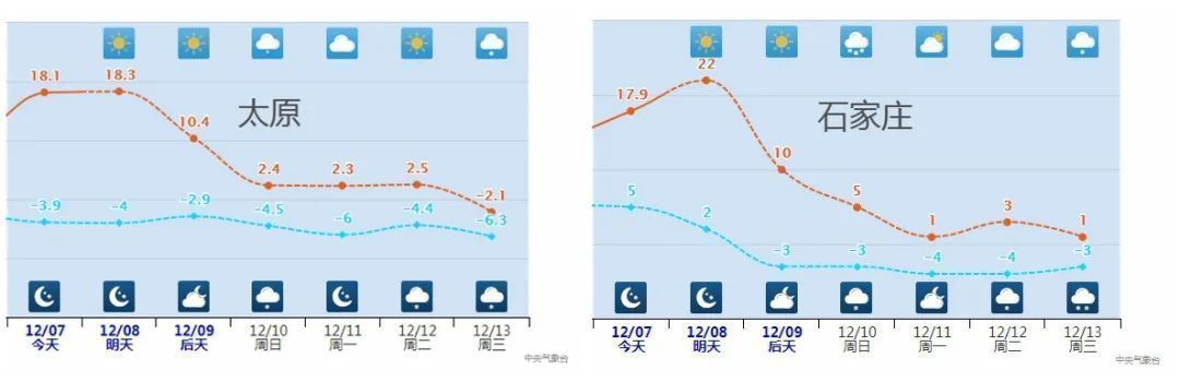 今天,中东部大部地区维持升温态势,多地将体验到12月同期罕见暖热。由于昼夜温差大,太原、石家庄等地一天可体验2个季节。然而,明天起,两轮冷空气“无缝衔接”,中东部多地将经历俯冲式降温:东北、华北、黄淮局地降幅超15℃,不少地方两三天最高气温累计降幅将超20℃。