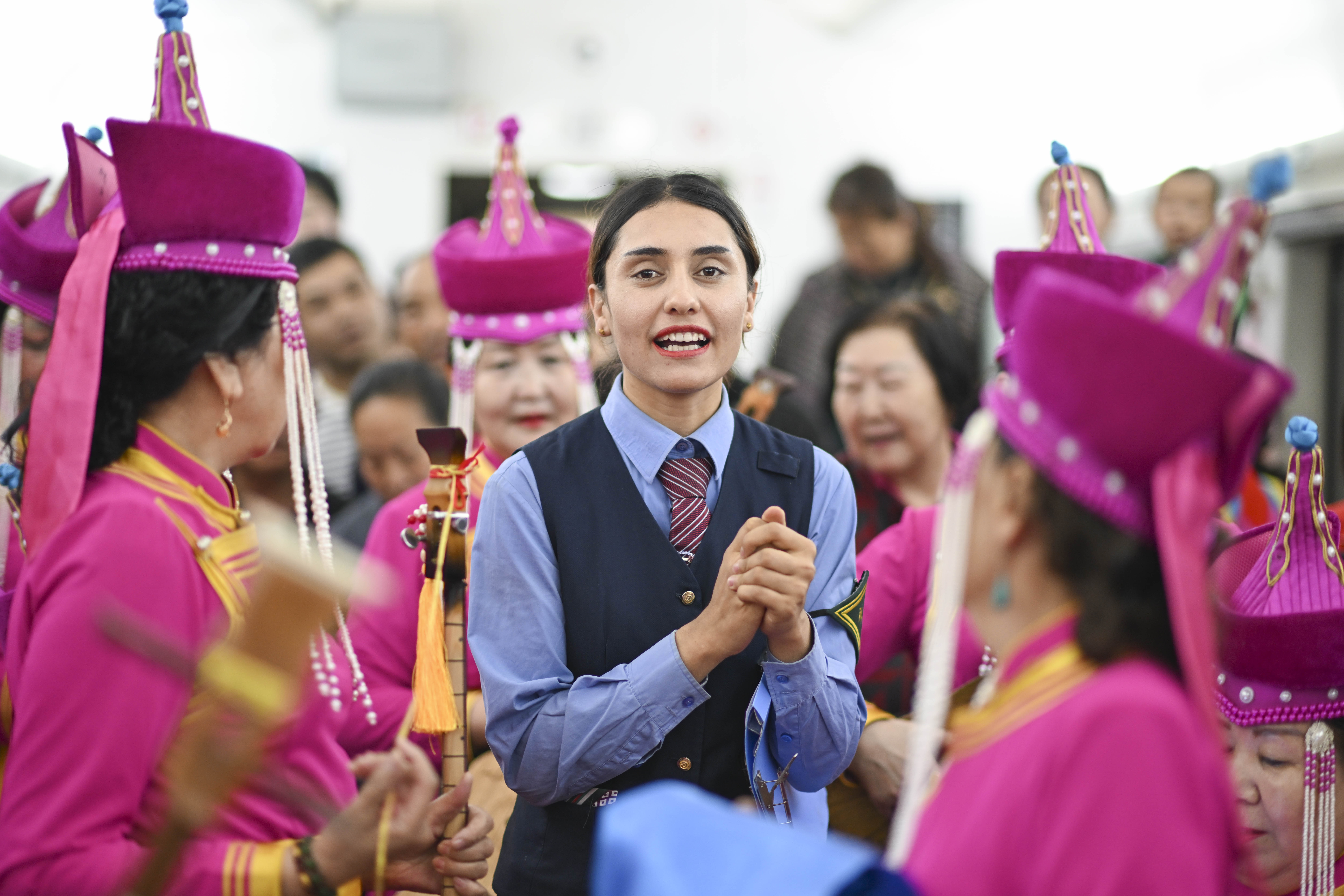 在由喀什开往成都西的列车上,艾尔开牙·多力开与民间艺人一起为乘客跳舞(4月19日摄)。